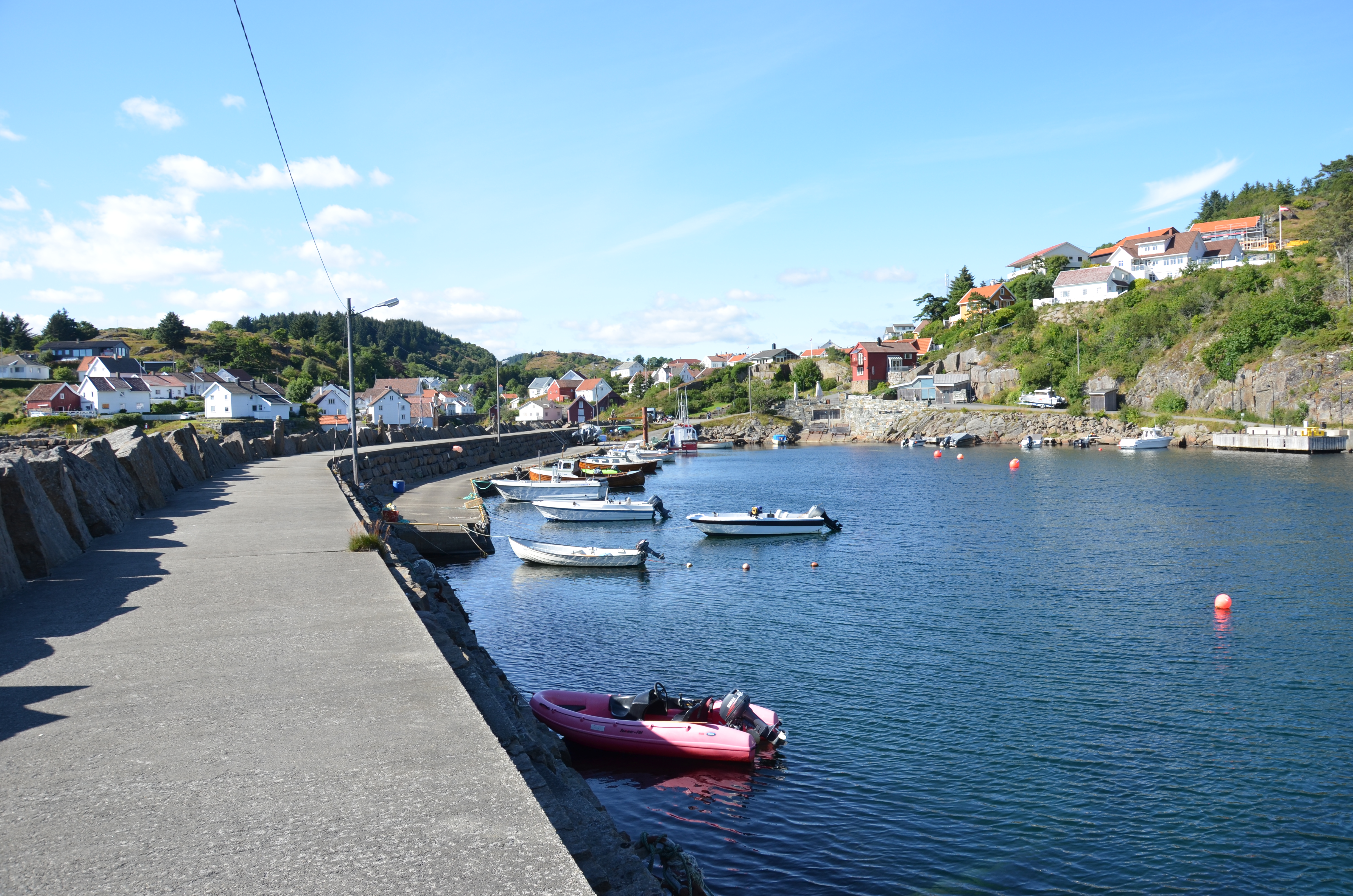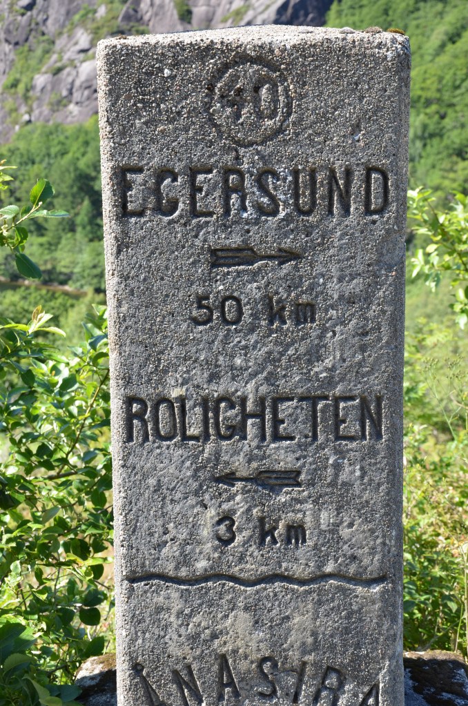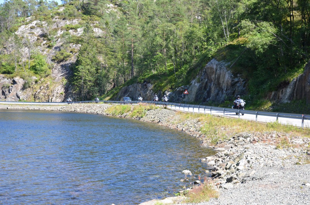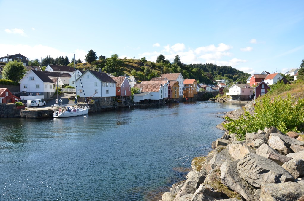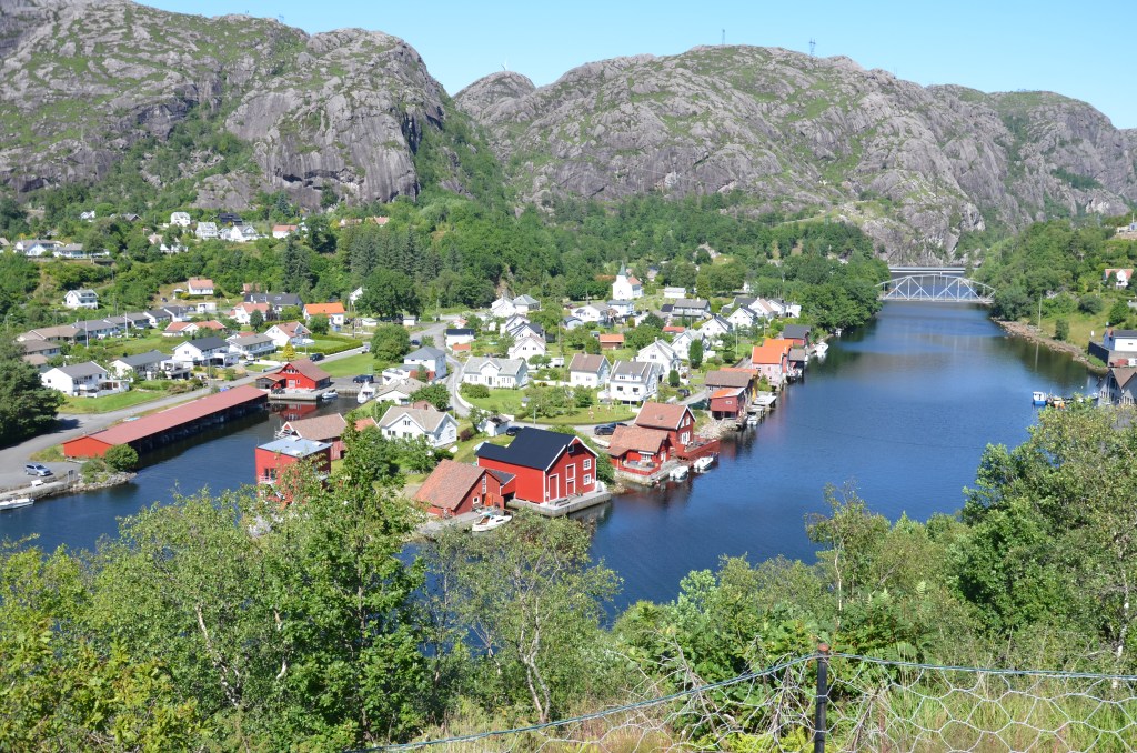 La traversée se fait dans un salon bruyant mais avec un siège confortable, le roulis du ferry est propice à la somnolence. Nous arrivons à Kristiansand et le débarquement se fait sans trop d’attente. Sortie du port, nous refaisons un plein de carburant, et on roule vers l’Ouest, vers Stavanger. Puis, à Fleekefjord, nous quittons cette route, la E39, pour la route 44 qui est plus proche de la côte. Une autre pose photos, nous laisse admirer le village de Jossingfjord.