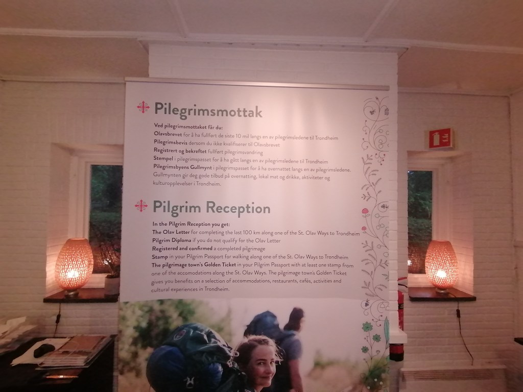 La moto est resté au parking aujourd’hui, parking privé de cet Hôtel qui accueille entre autres, les pèlerins (Pilgrim) qui ont marché sur 100 kms jusqu’à la cathédrale Nidaros voisine. Ils reçoivent alors, à leur arrivée, la lettre d’Olav et un tampon sur leur carnet, pour valider leur marche.