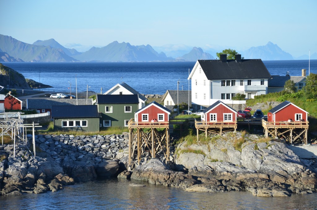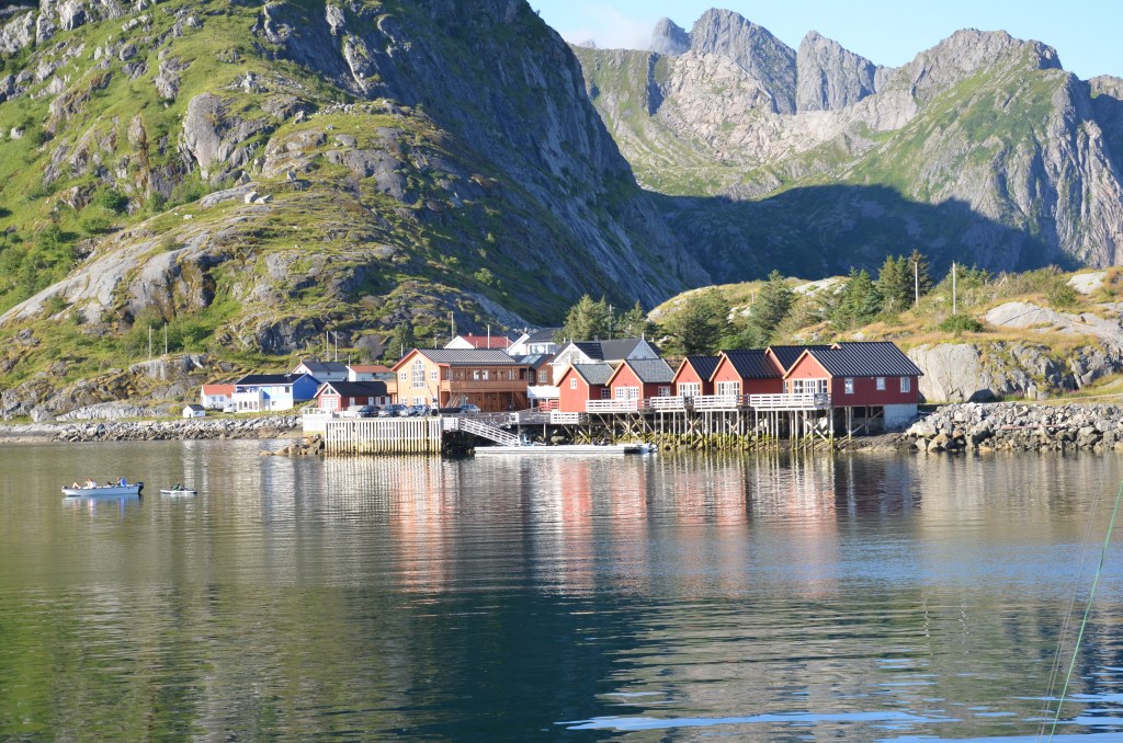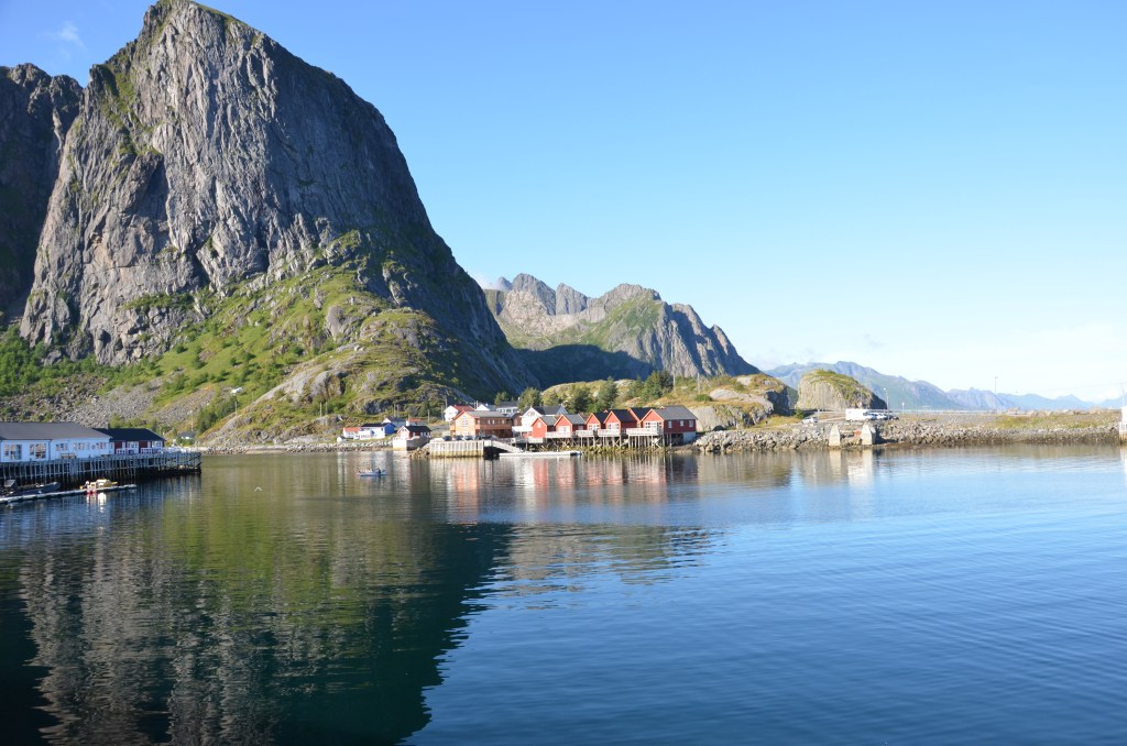 La traversée jusqu’à Moskenes, qui est un village de Lofoten, se fait en 3 heures. Sous un ciel bleu et ensoleillé, nous débarquons et les premières impressions sont extraordinaires, les petits villages de pêcheurs au pied de falaises vertigineuses, sont d’une beauté à couper le souffle.