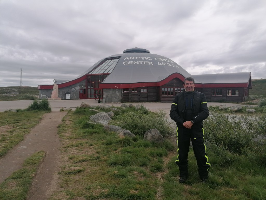 Le cercle polaire est marqué par un grand bâtiment en forme de sphère aplatie, avec café/bar et boutique de souvenirs. Nous rencontrons et discutons avec deux motards français partis de Savoie et qui font le même tour que nous, mais en sens inverse: ils ont commencé par la Suède.
